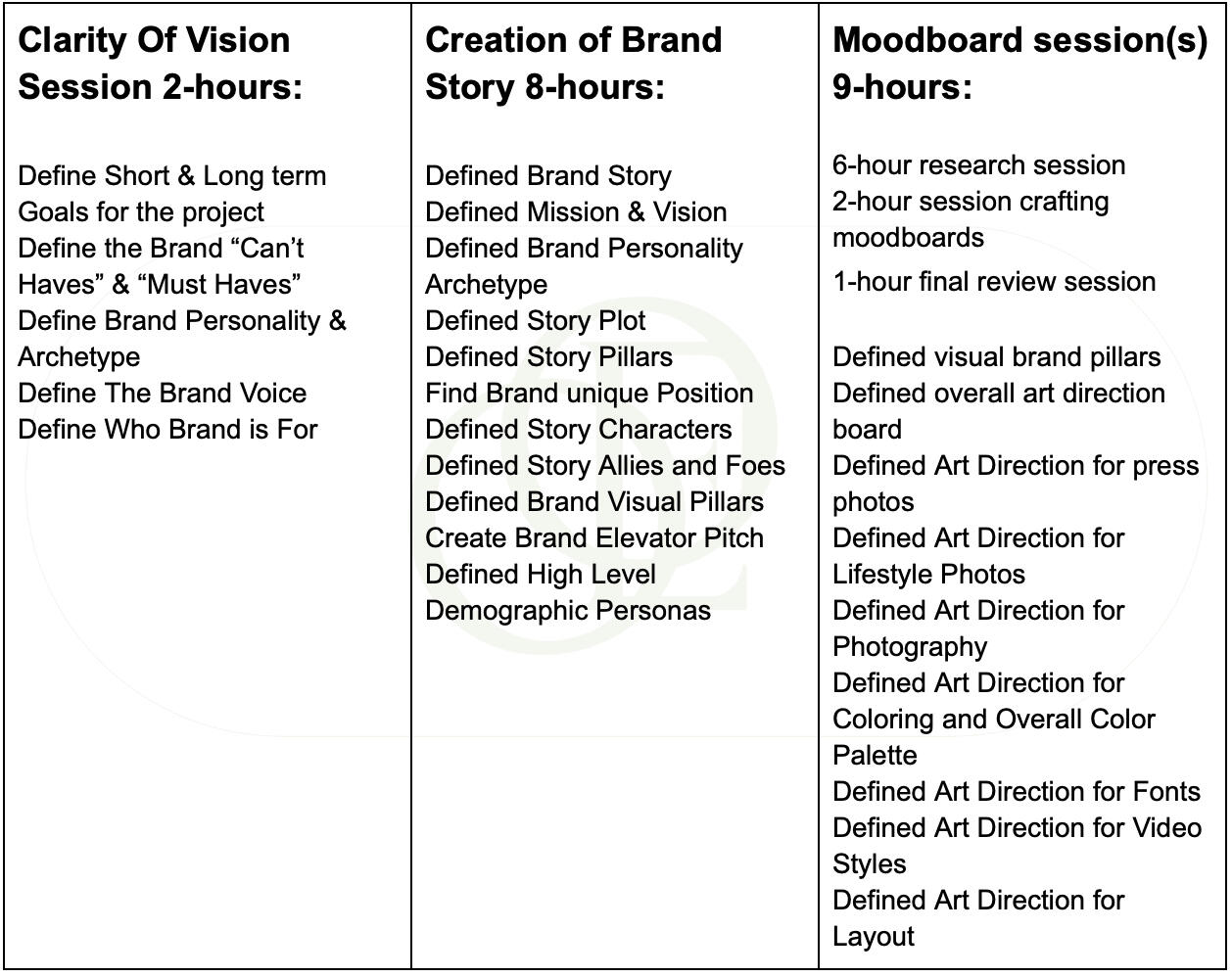 "Set the Vision" Extended Brand Build, 60 Days | $10,000 USDIn this offering, we will take everything from the “Basic Brand Build” and add the following deliverables with the addition of an “Execution Phase” where we will map the blueprint to how best to push the narrative of your brand.Extended Crafting Phase: